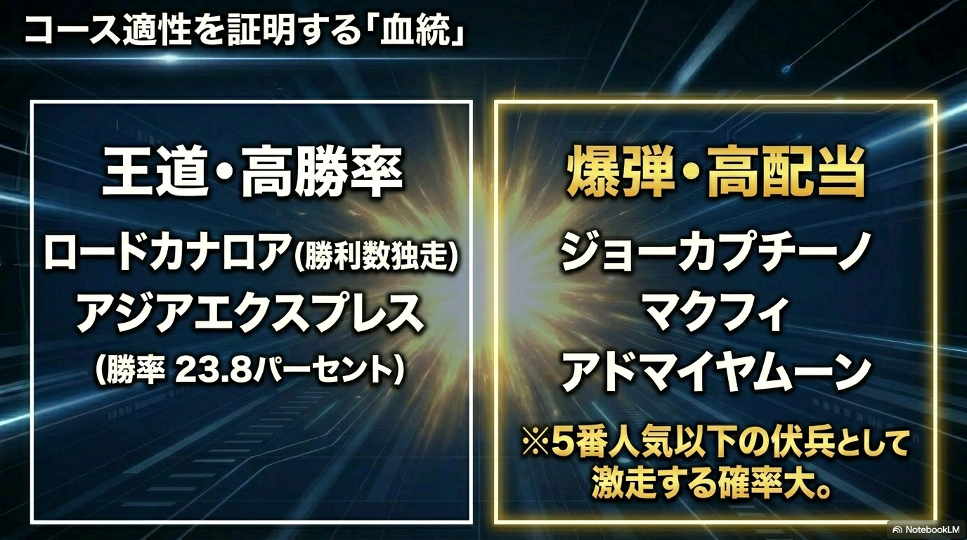 - 物理的適性:480kg以上のパワフルな馬体と、米国型のスピード血統(ディスクリートキャットやロードカナロア等)が組み合わさった時が最大の勝負時。