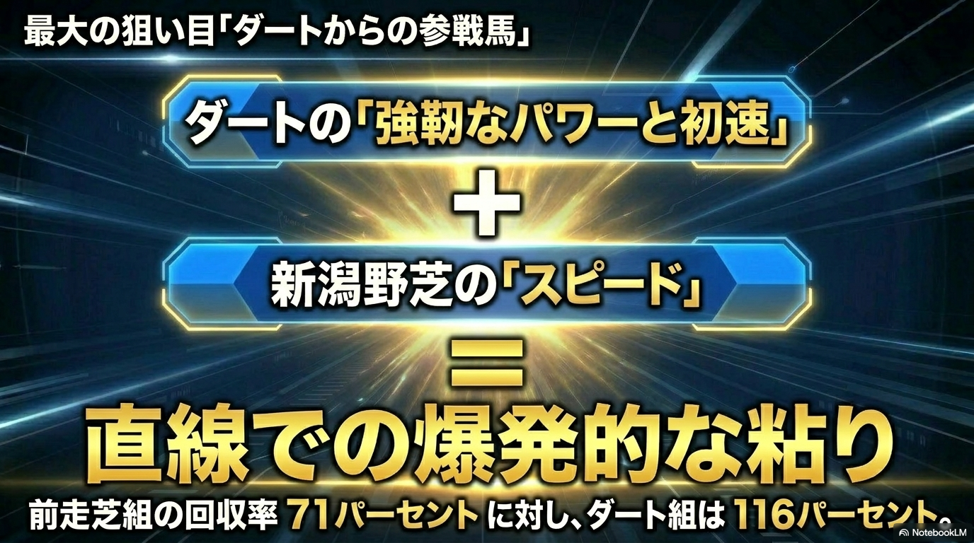 前走芝組の単勝回収率が71%程度なのに対し、ダートからの転戦馬は116%に達します。ダートで培った初速の速さと、砂を蹴り上げる強靭なパワーが、新潟の野芝と噛み合った瞬間に爆発的な粘りを発揮するんです。特に「ダート短距離で先行して大敗したが、テンの3ハロンは速かった」という馬が外枠を引いた時は、問答無用で買い目に入れるべき激アツ条件かなと思います。