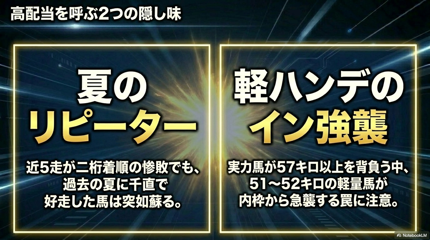 たとえ近5走が二桁着順の惨敗続きであっても、過去に千直で1着、あるいは0.3秒差以内の好走歴がある馬は要注意です。特に「春の時計がかかる開催」ではなく、「夏の高速決着」で実績を上げている馬が、同条件の夏開催に出てきた時は最大級の警戒が必要です。こうしたリピーターたちは、パドックで見栄えがしなくても、返し馬で直線に入った瞬間にスイッチが入ることが多いんですよね。