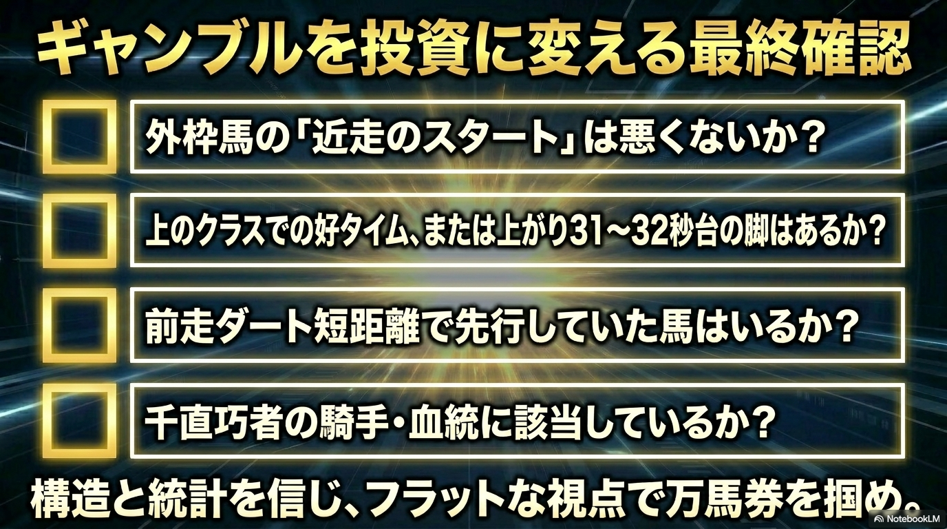 - 当日の風向きが「追い風」なら前残り、強烈な「向かい風」なら差し馬の時計を信頼する。