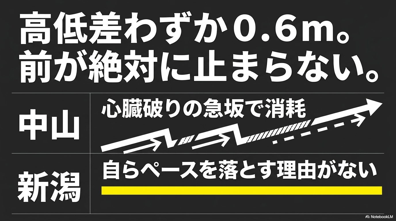 この「0.6m」という数値が何を意味するのか。例えば、中山競馬場ダート1800mのようにスタート直後とゴール前に心臓破りの急坂が待ち構えているコースや、京都競馬場の「淀の坂」のように向正面で大きなアップダウンを強いられるコースとは、競走馬が受ける肉体的負荷の質が根本から異なるということです。坂がないということは、馬にとって「自らペースを落とす理由がない」環境なんですよね。一度スピードに乗った先行馬の心肺機能が削られにくいため、最後の直線に入っても脚色が衰えず、結果として「前が止まらない」という新潟特有の鉄板バイアスが完成するわけです。