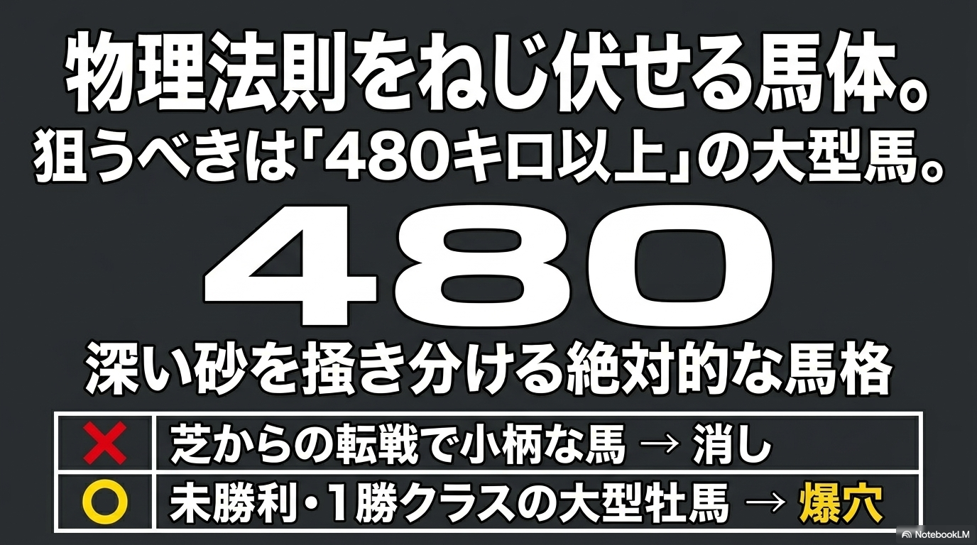 「平坦コース=軽い馬が有利」というイメージを持つ方も多いかもしれませんが、新潟のダートにおいてはその逆が真実です。JRAの公式発表でも、ダートのクッション砂の厚さは一律9センチメートルと定められていますが(出典:JRA『馬場状態の解説』)、新潟は特に砂が舞いやすく、脚が深く潜り込む性質があります。 この深い砂を力強く掻き分けるためには、480kgを超えるような絶対的な馬格(パワー)が必要不可欠なんです。
