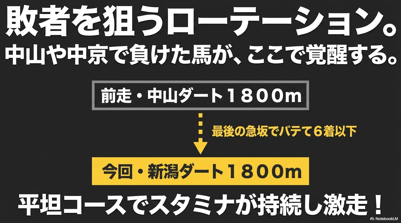 - 中山ダート1800mのような「タフな坂」でバテずに好走した実績こそ、平坦新潟の消耗戦で活きる