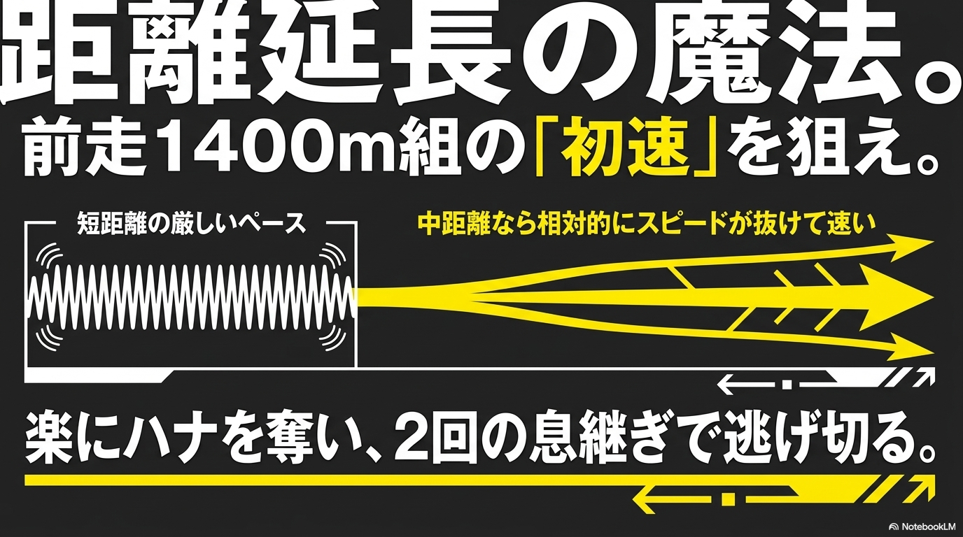 しかし、距離延長馬が外枠からスムーズに加速し、道中で「2回息がつく」新潟特有のラップ構成(コーナーでペースが緩むリズム)にハマれば、スタミナの不安は最小限に抑えられます。むしろ、他の中距離馬が追走に苦労する中、楽な手応えで4コーナーを回れるため、結果としてそのまま押し切ってしまうんです。この「前走1400m組×外枠」の組み合わせは、まさにオッズの盲点といえるかなと思います。