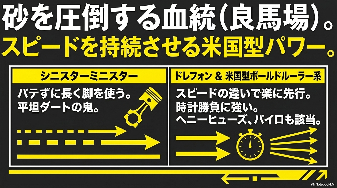 特に良馬場での時計勝負に強く、上位人気に支持されたドレフォン産駒の先行馬は、軸馬としての信頼度が非常に高いかなと思います。 同様に、ヘニーヒューズやパイロといった米国型ボールドルーラー系の種牡馬も、逃げ・先行脚質と組み合わさることで最強のパフォーマンスを発揮します。これらの種牡馬は、不器用な差し馬よりも、前々で揉まれずに運べる展開でこそ真価を発揮するので、枠順とセットで評価するのが正解ですね。