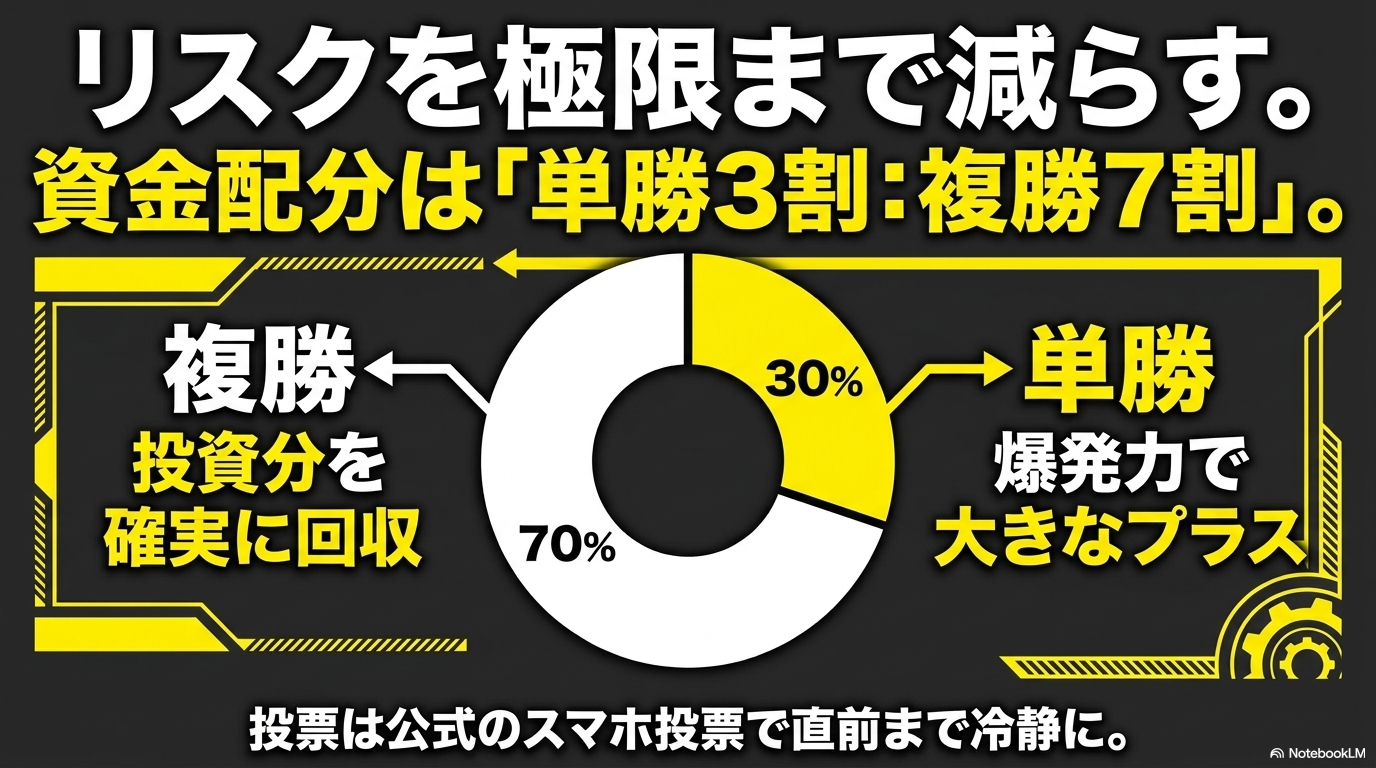 例えば予算が1,500円なら、単勝に500円、複勝に1,000円といった具合ですね。これなら軸馬が惜しくも2着や3着に敗れた時でも、複勝の配当で投資分を回収(あるいは微増)させつつ、1着に来た時には単勝の爆発力で大きなプラスを手にできます。こうしたメンタル管理を含めた買い方のコツについては、こちらの競馬の資金配分で負けないための考え方の記事でも詳しく書いているので、ぜひ参考にしてみてください。
