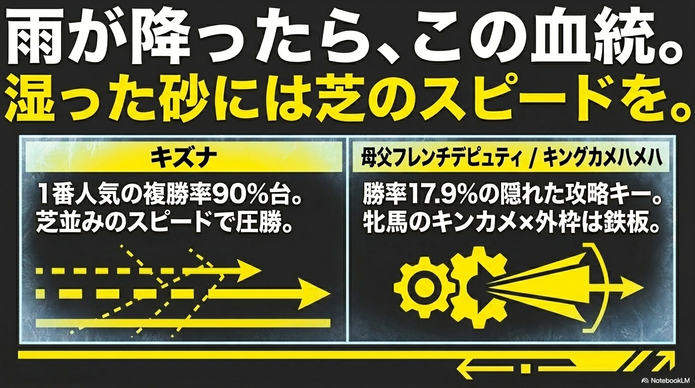 キズナ産駒は、1番人気に支持された際の複勝率が90%台というデータもあり、非常に堅実。特に道悪(稍重〜不良)になると、芝並みのスピードをダートで繰り出し、他馬を寄せ付けない圧勝劇を見せることも少なくありません。