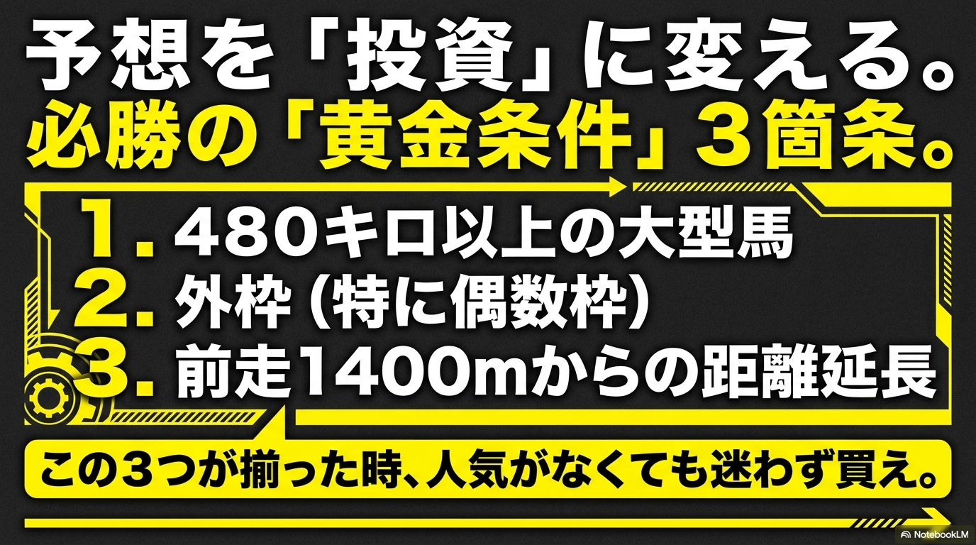 過去10年のデータを深く掘り下げていくと、人気薄でも馬券圏内に飛び込んでくる伏兵には、共通の「物理的な理由」と「陣営の狙い」が隠されていることが分かります。ここでは、私が実戦で重宝している穴馬抽出の3つの鉄則を詳しく解説しますね。