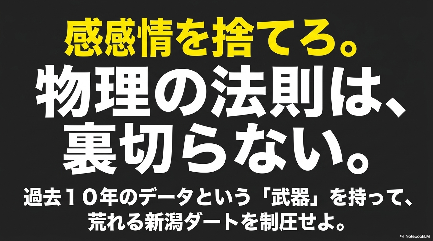 ここまで、新潟競馬場ダート1800mの過去10年における膨大なデータを多角的に解析してきました。このコースは一見すると「日本一長い直線」という芝コースのイメージに引っ張られがちですが、ダートに関しては全く別物。むしろ、徹底した「前残り」と「立ち回りの器用さ」が問われる、極めてロジカルな舞台であることがお分かりいただけたかなと思います。