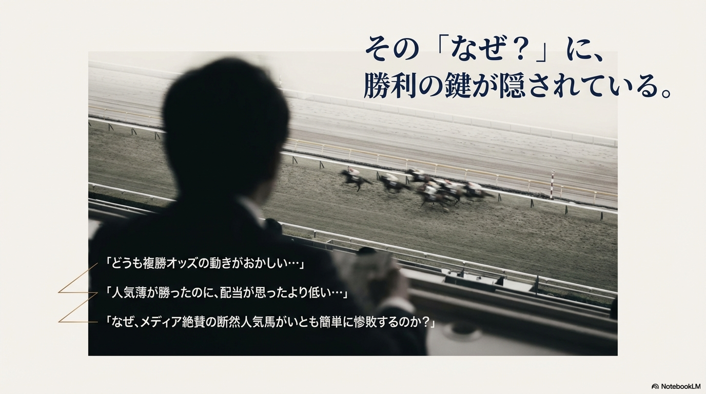 - 他の券種との合成オッズ狙い: 一部のプロ馬券師は、複数の券種を組み合わせて、あたかも一つの金融商品のようにリスクとリターンをコントロールします。例えば、「ワイド総流し」の保険として、その軸馬の複勝も同時に大量購入する、といった戦略です。このような特定の戦術が、複勝オッズだけを不自然に押し下げる原因となることがあります。