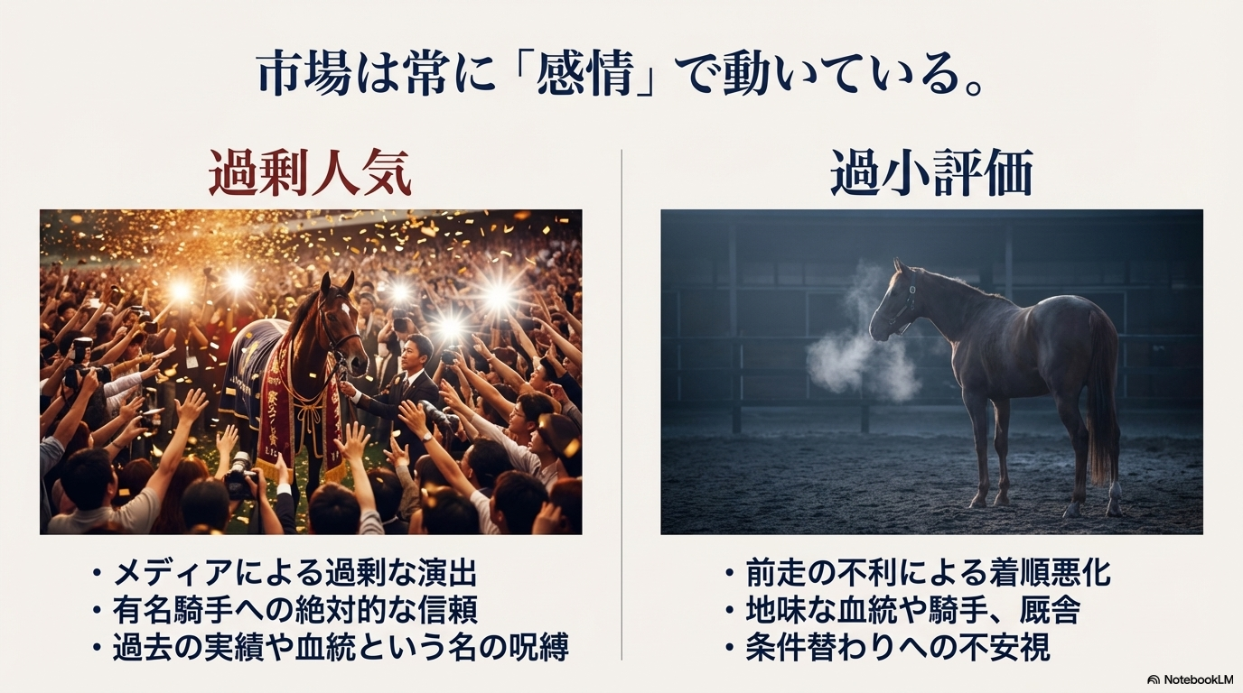 では、なぜこのような歪みが生まれるのでしょうか。その根源は、ファンの投票行動に影響を与える、合理的・非合理的な様々な外部情報にあります。馬券を購入するファンの心理は、純粋な能力比較だけでなく、様々なバイアスに左右されるため、そこに付け入る隙が生まれるのです。ここでは、オッズが歪む代表的な要因を「過剰人気」と「過小評価」の2つの側面から深掘りしていきます。