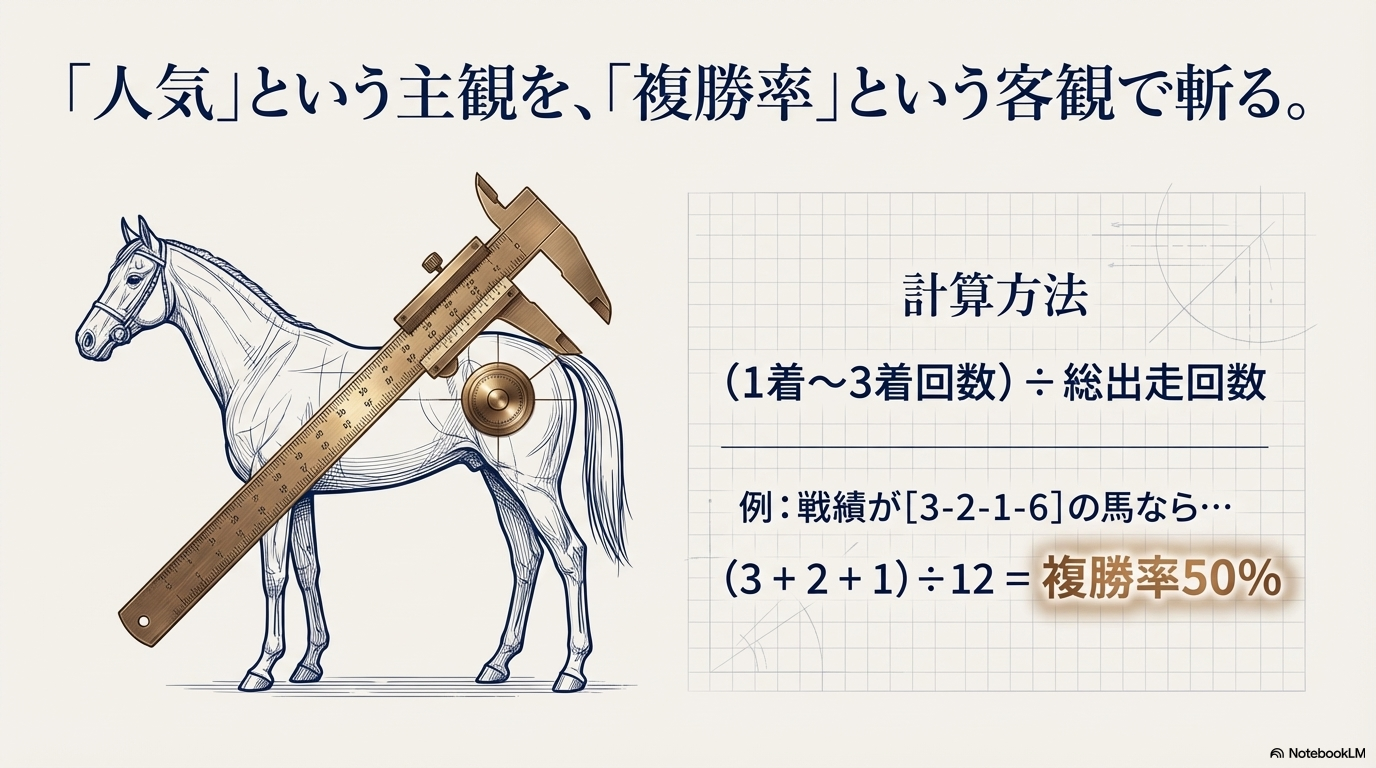 - 客観的な指標を活用する:複勝率は、出走馬の安定感や堅実さを示す重要な客観的指標となります。この数値と現在の人気(オッズ)を比較することで、過剰人気や過小評価を判断できます。