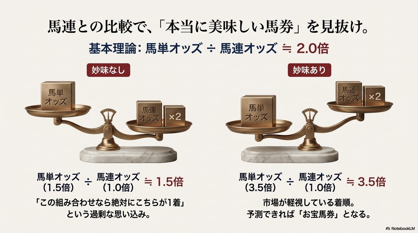 - 券種間のオッズを比較する:馬単オッズが馬連オッズの2倍以上あるか、3連単オッズが3連複オッズの6倍以上あるかを確認することで、市場が着順をどう評価しているかの偏りを読み解き、期待値を測ることが重要です。
