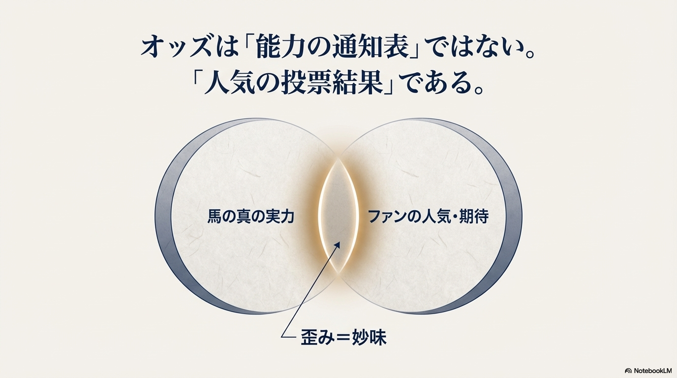まず、全ての基本となるのは、オッズが「馬の能力」そのものではなく、「ファンの支持率(人気)」を反映したものであるという事実です。この両者の間に生じるギャップこそが、私たちの利益の源泉となります。