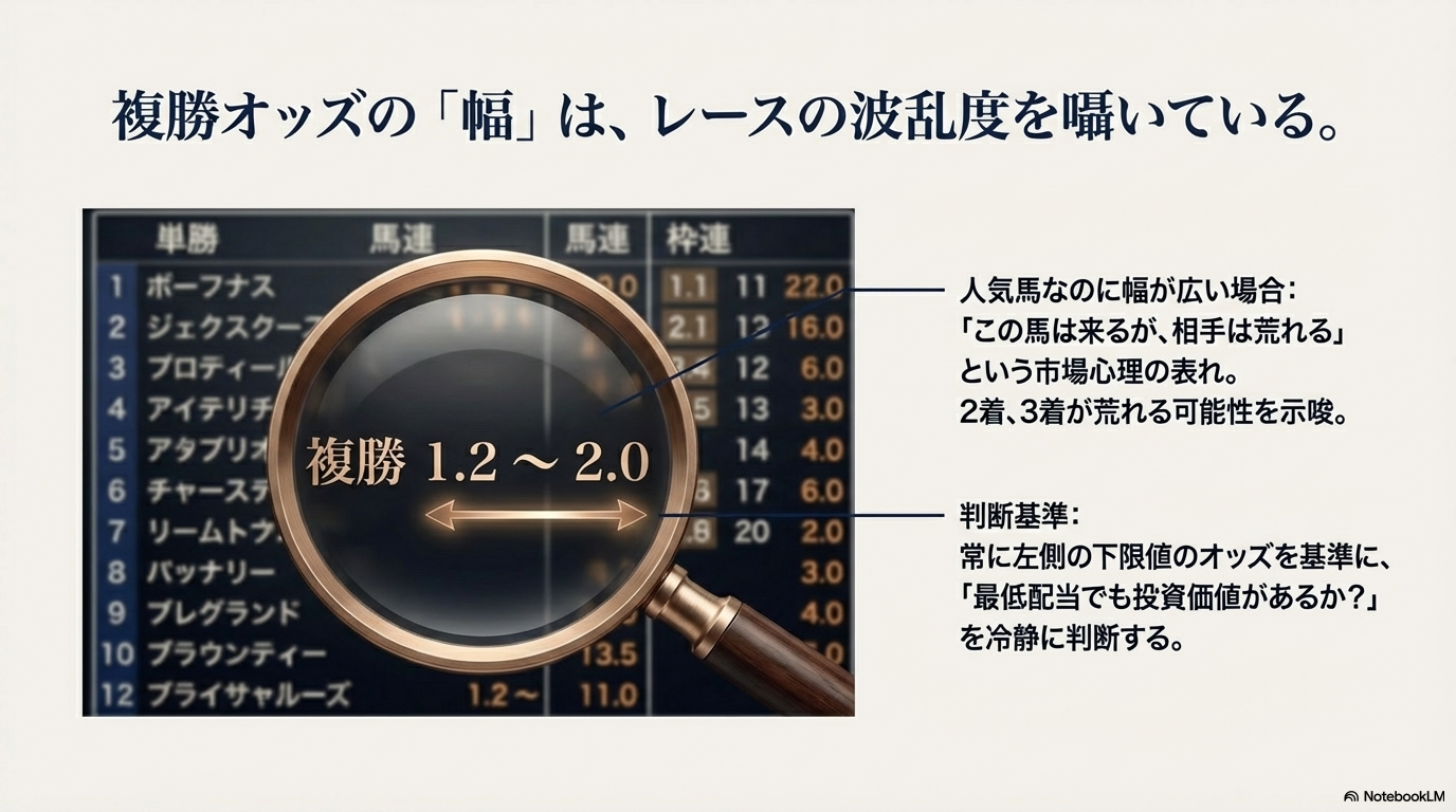 この複勝オッズの幅は、単なる配当の範囲を示すだけではありません。経験豊富なファンは、この「幅の広さ」からレースの性質を読み解きます。