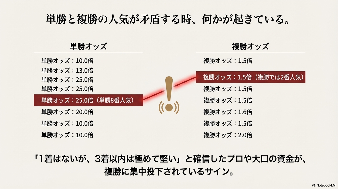 この状況は、単勝馬券を買うファンからは「まず1着はないだろう」と低評価を受けているにもかかわらず、複勝馬券を買うファン(あるいは特定の誰か)からは「3着以内には極めて高い確率で来るだろう」と、大量の資金が投じられていることを示しています。これが「おかしい」と感じる歪みの本質であり、俗に「異常オッズ」とも呼ばれる現象です。