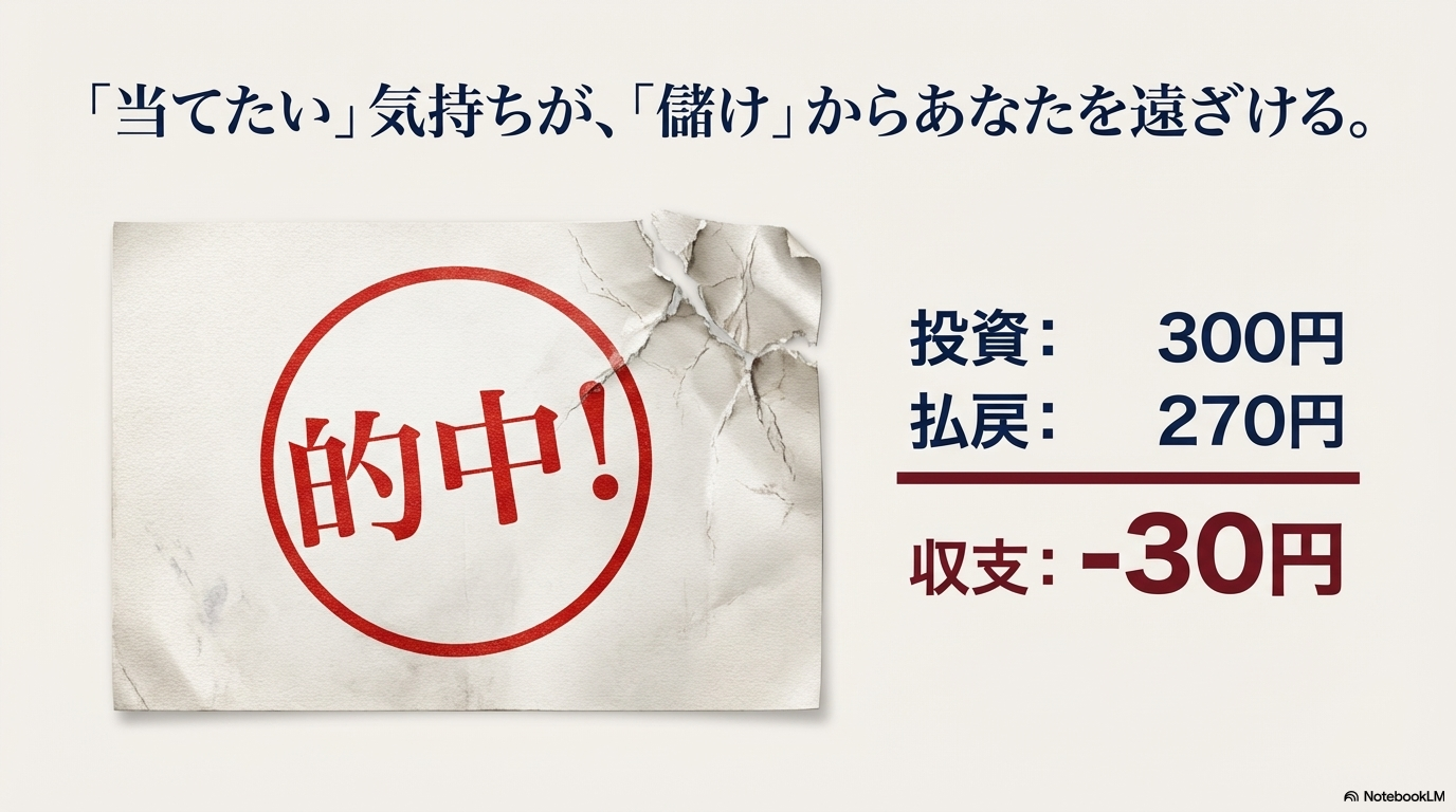 競馬で負ける最大の原因は、「儲けたい」という気持ちよりも「当てたい」という気持ちが勝ってしまうことです。トリガミは、まさにこの心理が生み出す罠です。的中しても利益が出なければ意味がない、という投資家としての冷静な視点を常に持ち続けましょう。