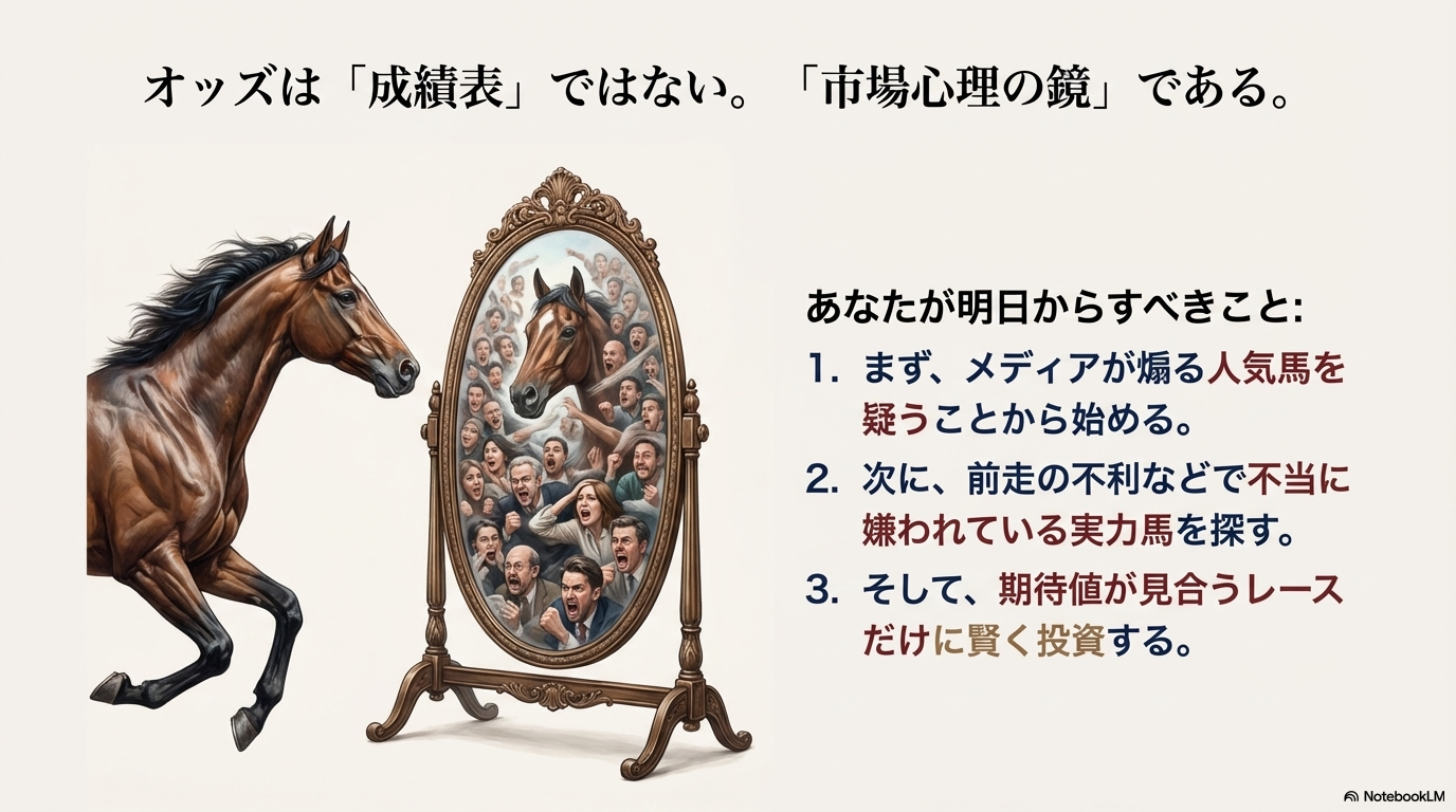 ここまで、競馬におけるオッズの歪みが生まれる仕組みから、それを見つけ出し、馬券戦略に活かすための具体的な方法と思考法について詳しく解説してきました。最後に、この記事の要点を改めて整理し、あなたが明日からの競馬予想で実践できる知識としてまとめます。