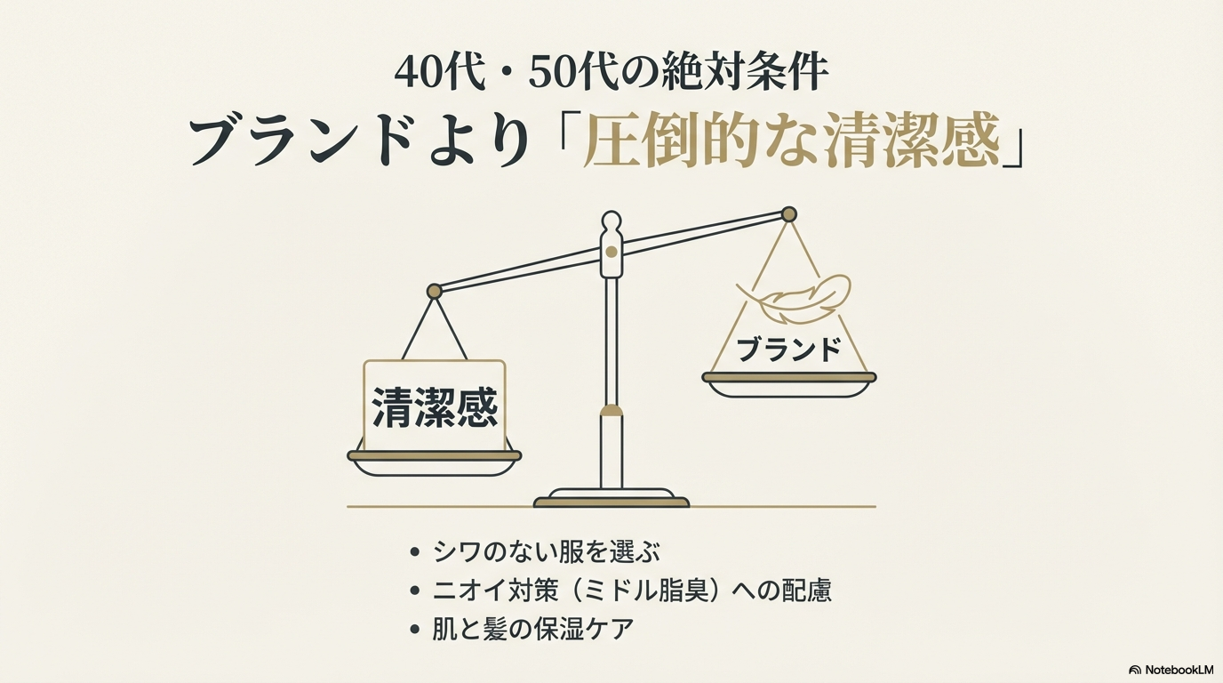 おじさん世代にとって、衣服のシワや汚れは「不潔感」に直結します。たとえ高価な服であっても、メンテナンスが行き届いていないだけで、「この人は自分に無頓着なんだな」というネガティブな印象を与えてしまいます。心理学的にも、服装は第一印象を決定づける重要な要素であることが示唆されています。例えば、男性の肌の明るさやコンディションが若々しい印象に大きな影響を与えるという研究結果もあり、服装と合わせたトータルな清潔感が求められる時代といえます(出典:株式会社マンダム『初対面の相手が「髪の量」より「顔の肌」で年齢を推測することが判明』)。