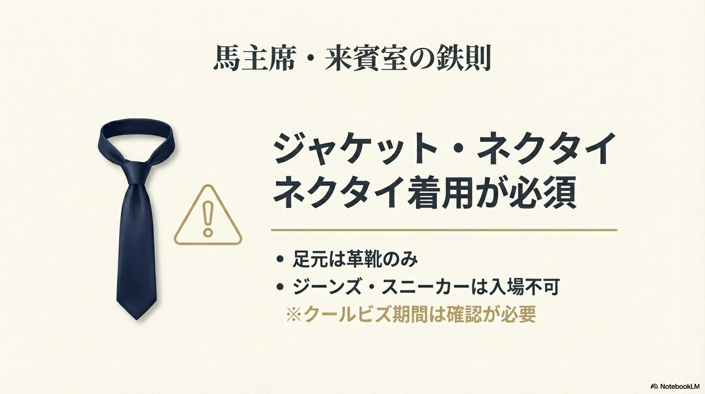 東京競馬場「ダービールーム」 ジャケット・ネクタイ必須 指定期間のみノータイ可(原則厳格) カジュアル全般、スニーカー