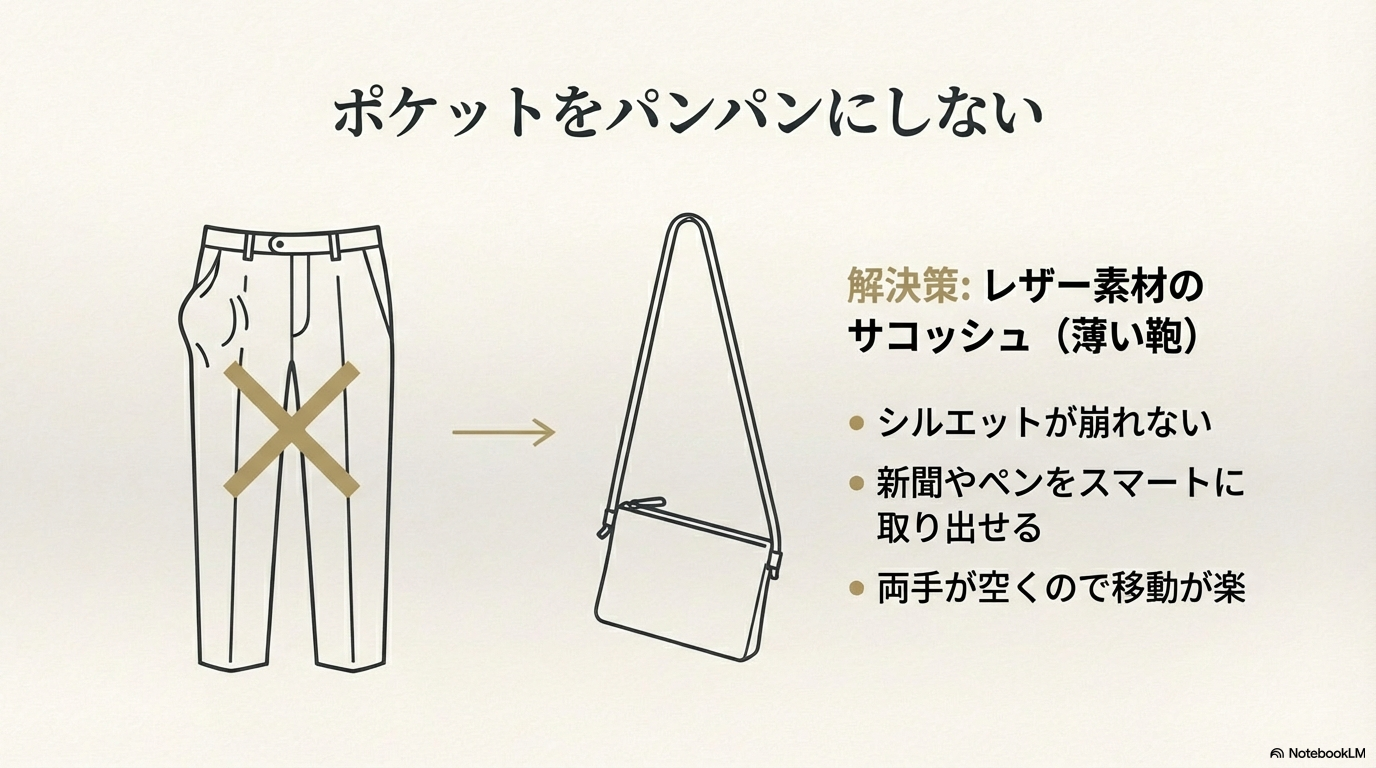 ただし、おじさん世代が選ぶなら素材選びには徹底的にこだわってください。ナイロン製のいかにもスポーティーなものは、どうしても「子供っぽさ」や「アウトドア感」が強すぎて、せっかくのスマートカジュアルな装いを台無しにしてしまいます。お勧めは、落ち着いた色合いの本革(レザー)素材や、シボ感のあるフェイクレザーです。これならジャケットの下に忍ばせても違和感がなく、むしろ「こだわりのある大人」の雰囲気を演出できます。