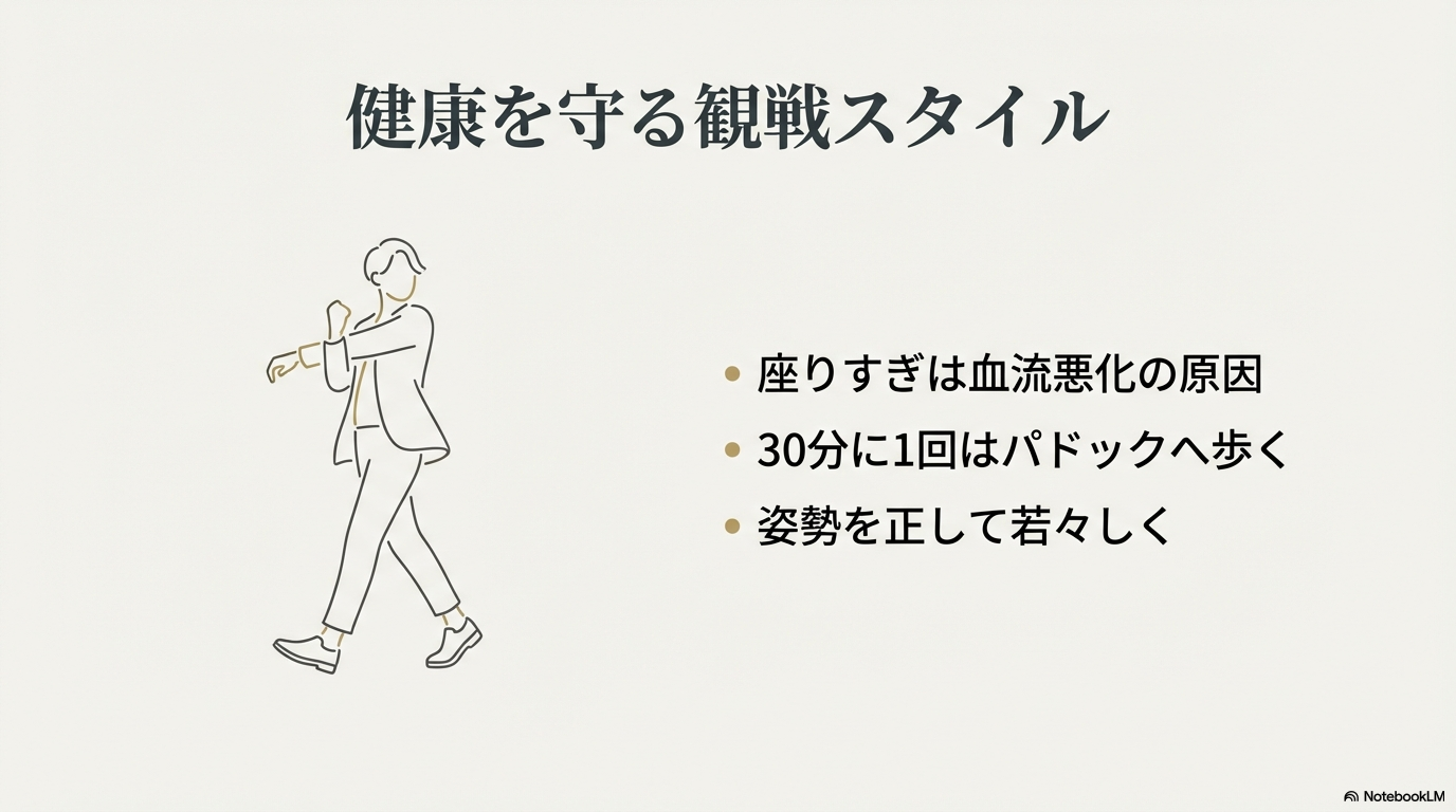 また、一つ健康面でのアドバイスを付け加えさせてください。私たちおじさん世代にとって、競馬場での長時間の観戦は意外と体に負担がかかるものです。特にスタンドの椅子に座りっぱなしで予想に没頭していると、血流が悪化し、腰痛や全身の疲労を招く原因となります。厚生労働省の報告でも、長時間の座位行動が健康リスクを高めることが指摘されており、こまめに立ち上がって体を動かす(ブレイクを入れる)ことが推奨されています(出典:厚生労働省 科学研究費補助金 研究班『成人の座りすぎ・座りっぱなし予防のポイント』)。