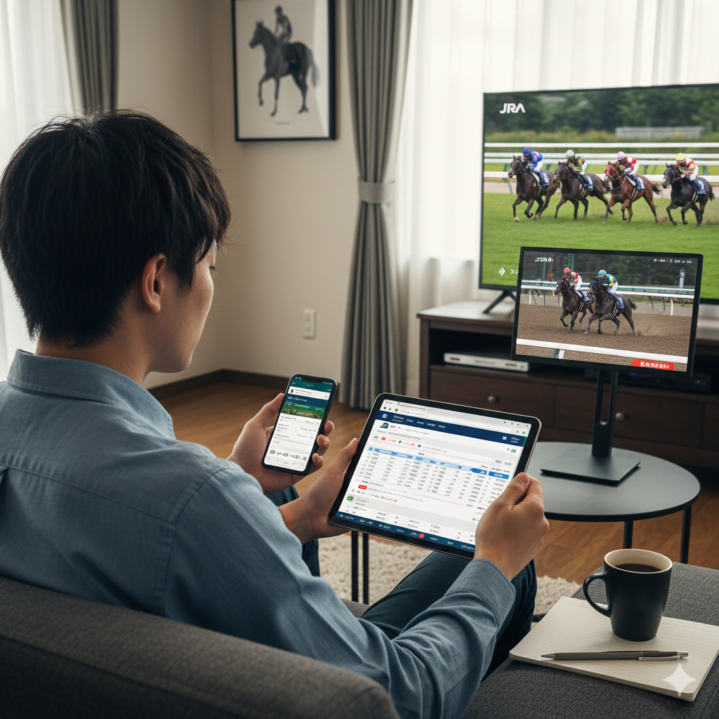 私は週末になると、デスクにこの環境を構築します。 【メイン画面】 PCやテレビで「JRAのレース映像」を流す。 【サブ画面】 スマホやタブレットで「即PATの投票画面」と「楽天競馬(地方競馬)」を開く。 こうすることで、JRAのレースを見ながら、合間に高知競馬のパドックをチェックする…といった、密度の濃い競馬ライフが可能になります。楽天競馬の画面をずっと見つめていても、JRAのファンファーレは一生流れてこないので、早めに視聴環境を整えておきましょう。