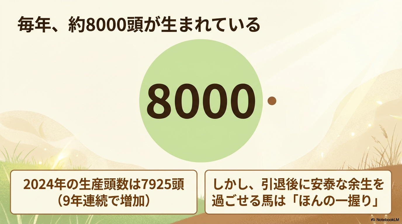 こうした背景には、近年の生産頭数の増加という現実もあります。最新の統計によると、2024年のサラブレッド生産頭数は7,925頭となり、なんと9年連続で増加しているんです。(出典:公益財団法人 ジャパン・スタッドブック・インターナショナル「2024年の生産頭数」) これだけ多くの馬が生まれている中で、引退後の受け皿をいかに広げていくかは、私たちファンにとっても無視できない課題ですよね。