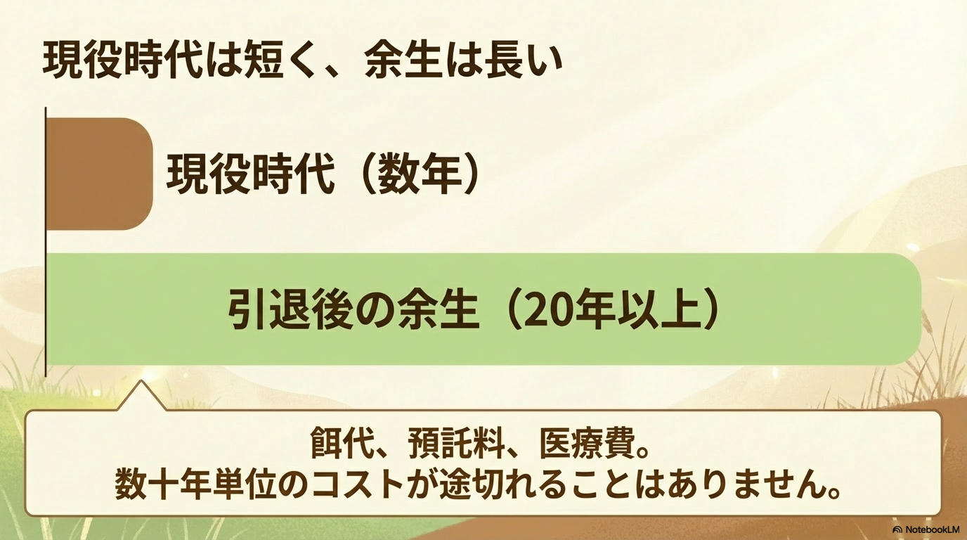 馬の寿命は生物学的に25歳から30歳ほどと言われていますが、競走馬としての現役期間は通常2歳から6歳前後です。つまり、引退してから天寿を全うするまでには、20年前後の「第二の馬生」が待っています。しかし、この期間を維持するためには、私たちの想像を超えるようなコストがかかり続けます。