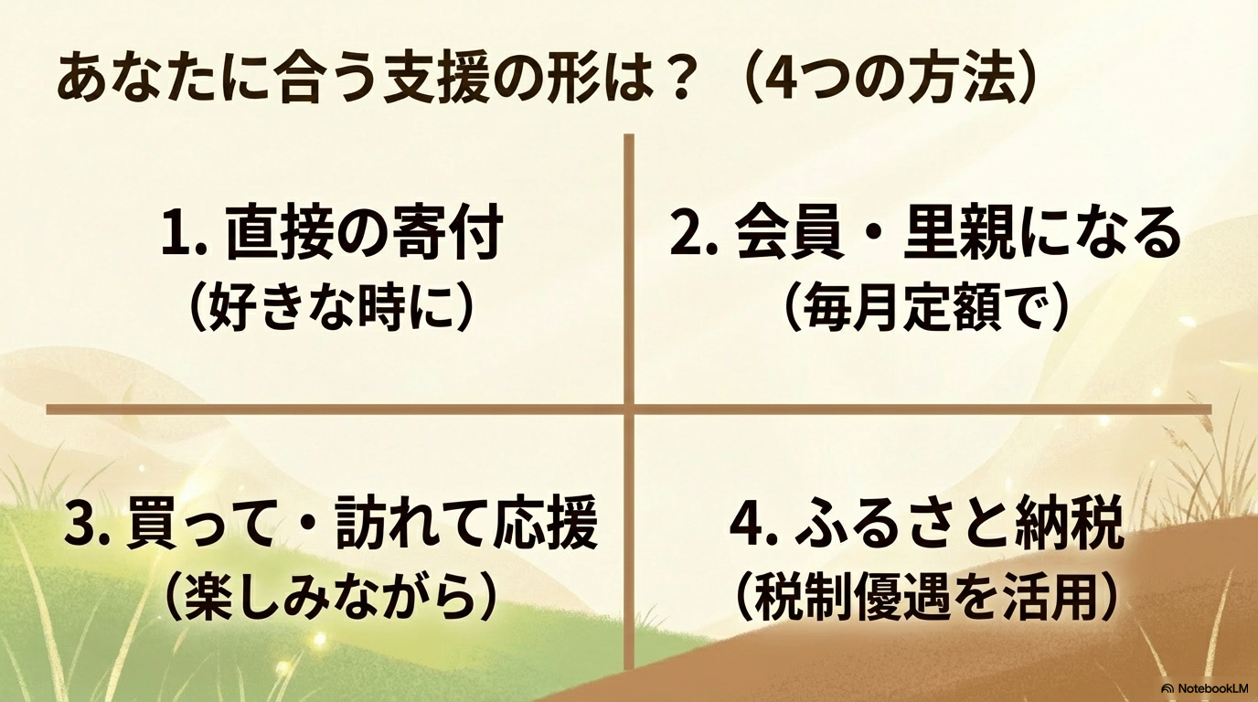 ここまで、民間の支援団体による「里親制度」や「ファンクラブ」、さらには牧場での「グッズ購入」など、さまざまな形の支援方法をご紹介してきました。それぞれの活動に独自の魅力があり、馬たちへの深い愛情が込められているのを感じますよね。その上で、私が「これから支援を始めたい」と考えている方に、最終的な「引退馬支援 おすすめ」の正解として自信を持って提案したいのが、ふるさと納税を活用した支援ルートです。