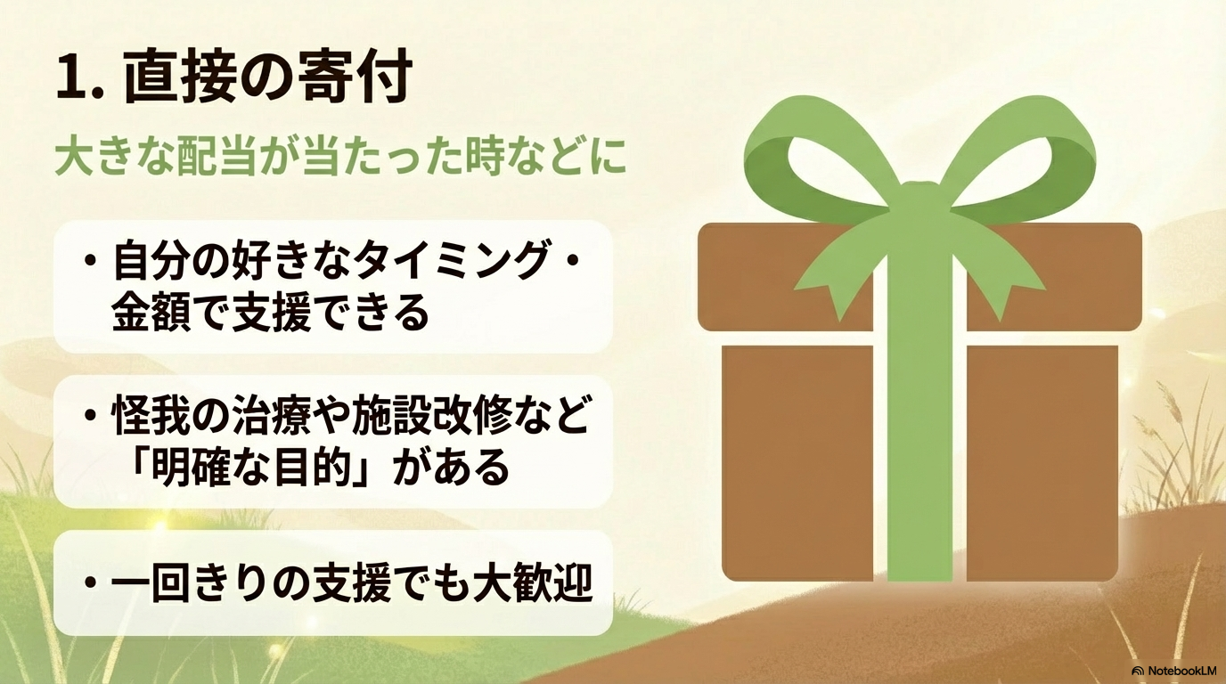 まず「直接的な寄付」は、認定NPO法人などが募集している基金に対して、自分の好きなタイミングで自由な金額を振り込む形式です。最近よく見かけるクラウドファンディングもこの一種で、特定のプロジェクト、例えば「怪我をした名馬の緊急手術費用」や「老朽化した厩舎の建て替え」といった、明確な目的のために即時的に資金を届けることができます。一回きりの支援でも全く問題ないので、競馬で大きな配当が当たった時や、SNSで気になる馬を見かけた時にすぐアクションを起こせるのが良いところですね。