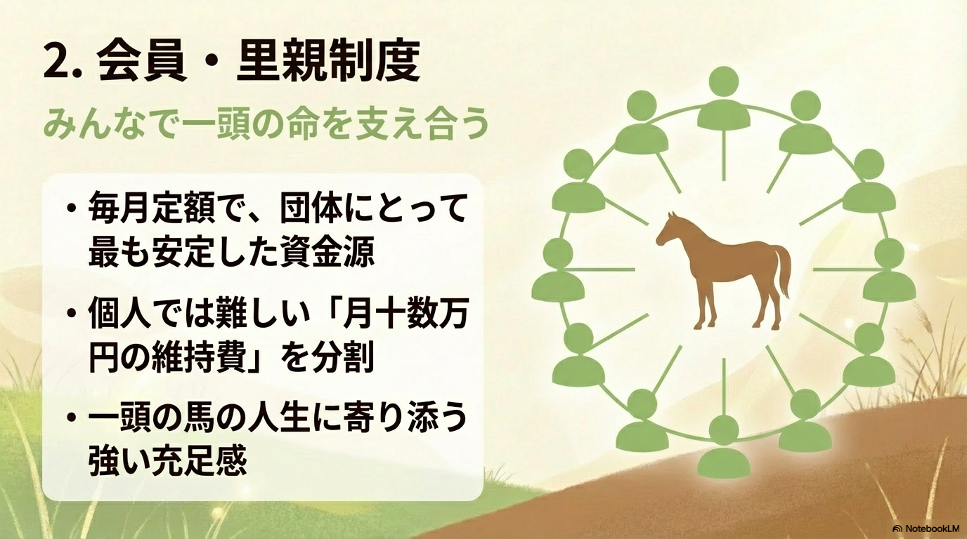 対して「会員制度」は、引退馬協会などが提供する「フォスターペアレント(里親)」のように、特定の馬や団体を毎月定額で支え続ける仕組みです。これは団体にとって最も安定した運営資金となるため、非常に喜ばれる支援の形です。馬は生き物ですから、毎日のエサ代や広大な放牧地の管理費が欠かせません。こうした継続的なサポートがあるからこそ、団体は安心して「この馬の余生を引き受けよう」という決断ができるわけです。会員になると、愛馬の近況報告が届いたり、牧場に会いに行けたりすることもあり、「一頭の馬の人生に寄り添っている」という強い充足感を得られるのが大きな魅力かなと思います。