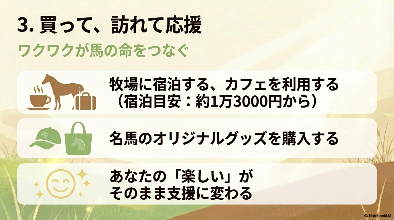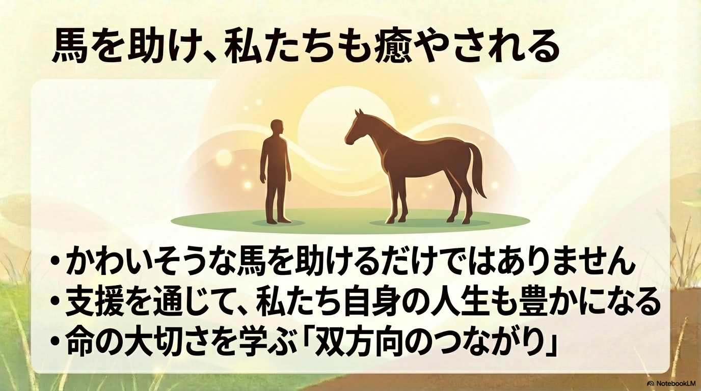 最後に、こうした支援活動は「かわいそうな馬を助ける」という消極的な理由だけでなく、馬との交流を通じて私たち自身が癒やされたり、命の大切さを学んだりする「双方向のメリット」があることも忘れないでくださいね。無理のない範囲で、楽しみながら馬たちの未来に投資していきましょう!
