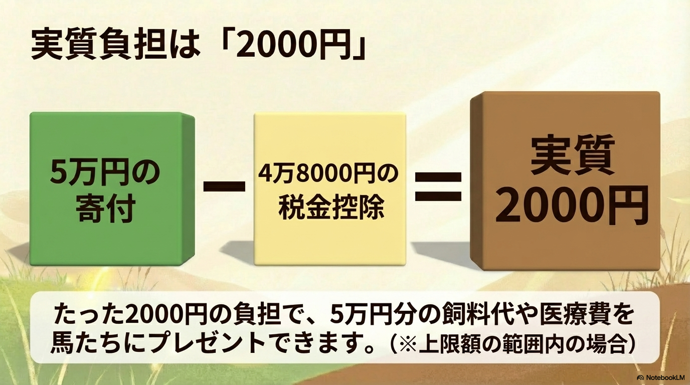 例えば、年収や家族構成にもよりますが、上限額の範囲内であれば5万円を寄付しても、確定申告(またはワンストップ特例)を行えば、翌年の税金から4万8,000円が差し引かれます。つまり、たった2,000円の負担で、5万円分の飼料代や医療費を馬たちにプレゼントできるということ。これは、認定NPO法人への直接寄付と比べても、金銭的なハードルが圧倒的に低く、寄付の「レバレッジ」が非常に高い方法と言えますね。競馬で的中した際のプラス収支を、この2,000円に充てるのも賢い使い道かもしれません。