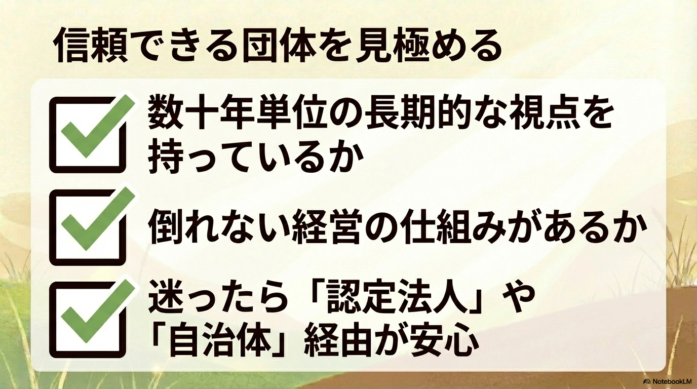 • 失敗しないための支援団体の選び方と、長期的に活動を支えるために理解しておくべき留意事項