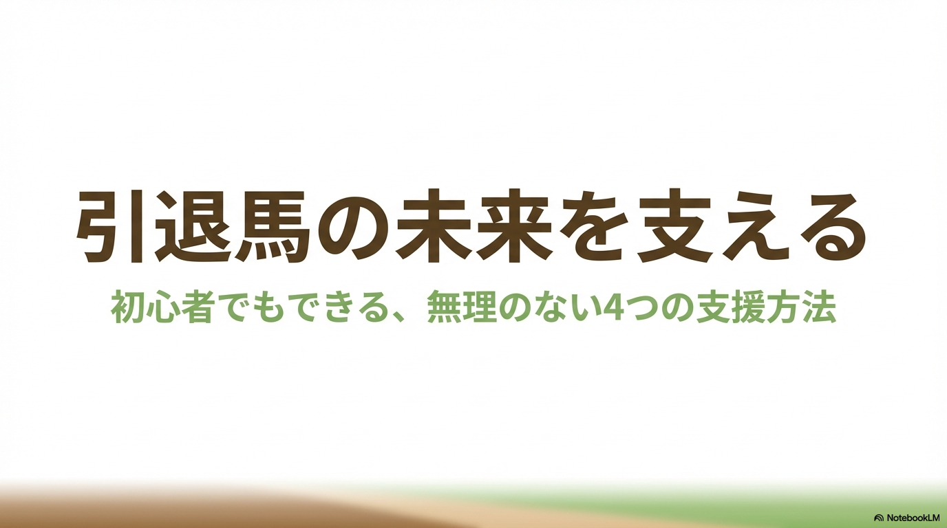 最後に、こうした支援活動は「かわいそうな馬を助ける」という消極的な理由だけでなく、馬との交流を通じて私たち自身が癒やされたり、命の大切さを学んだりする「双方向のメリット」があることも忘れないでくださいね。無理のない範囲で、楽しみながら馬たちの未来に投資していきましょう!