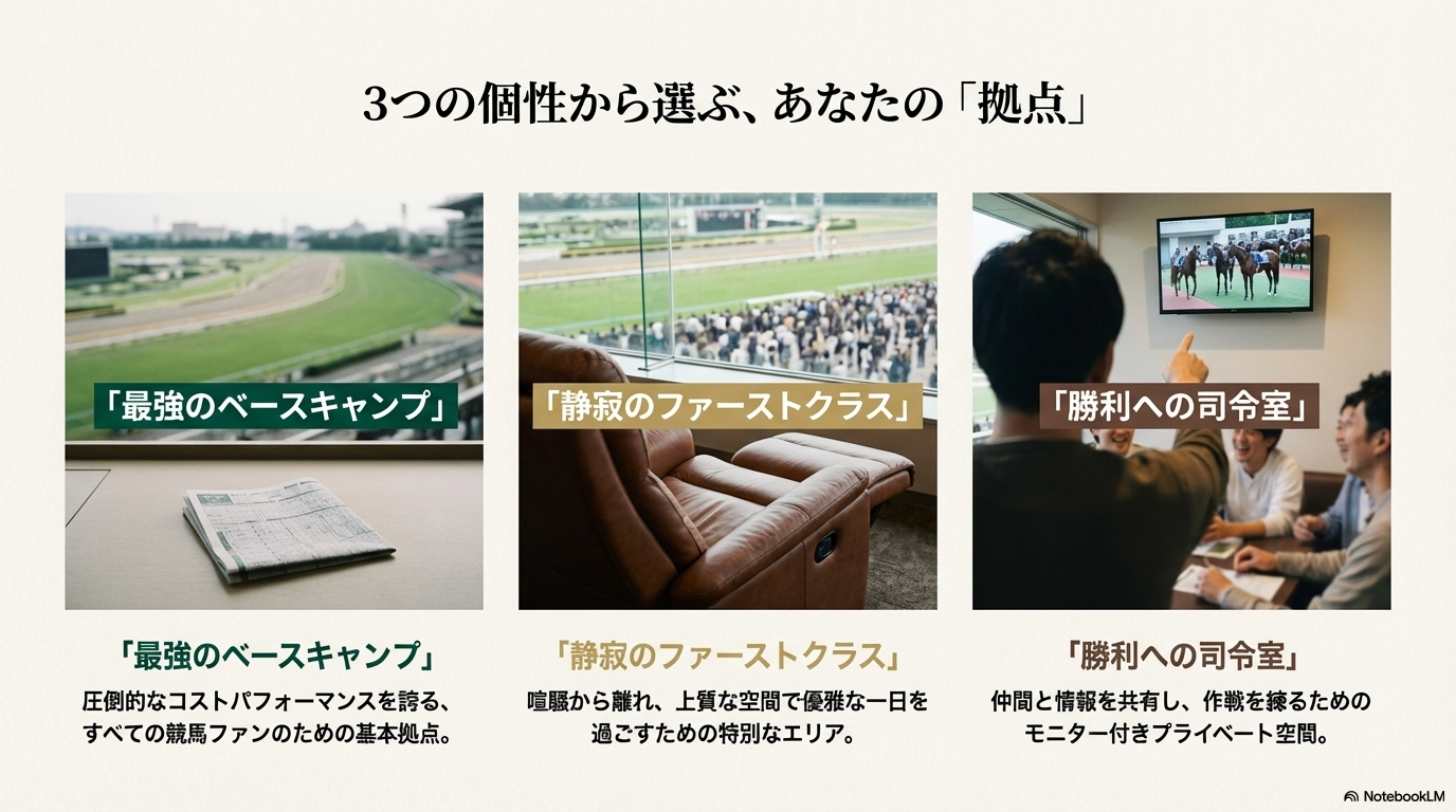 まさに、週末の隠れ家的な「VIPルーム」をワンコインで借りるような感覚です。「人混みが苦手だけど、家ではなく大きな画面で競馬場の雰囲気を感じたい」という方には、これ以上ない環境と言えるでしょう。