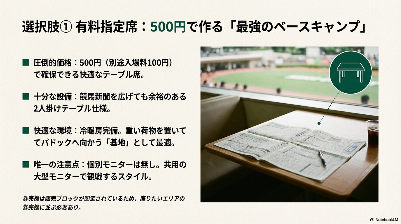「500円だから、ただ椅子があるだけでは?」と思われるかもしれませんが、設備はしっかりとした2人掛けのテーブル席仕様になっています。長時間の予想に耐えうるよう、テーブルの奥行きは競馬新聞(専門紙)を縦に広げても余裕があるサイズ感が確保されています。マークシートを塗る、赤ペンを置く、軽食を広げるといった一連の動作をストレスなく行えるのは、テーブル席ならではのメリットです。