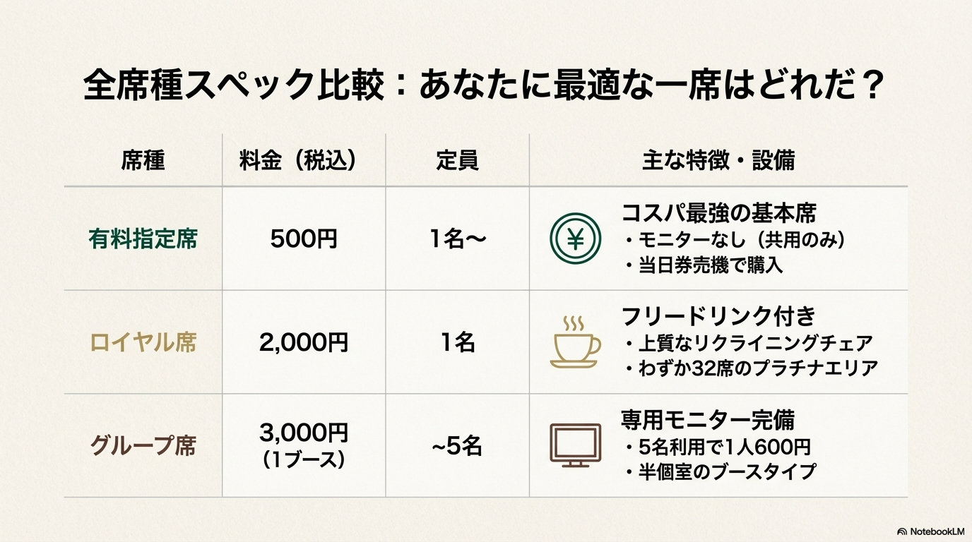 ロイヤル席の座席は、長時間の滞在でも疲れにくいよう設計されていますが、配置によって2つの異なるタイプが存在することをご存知でしょうか。