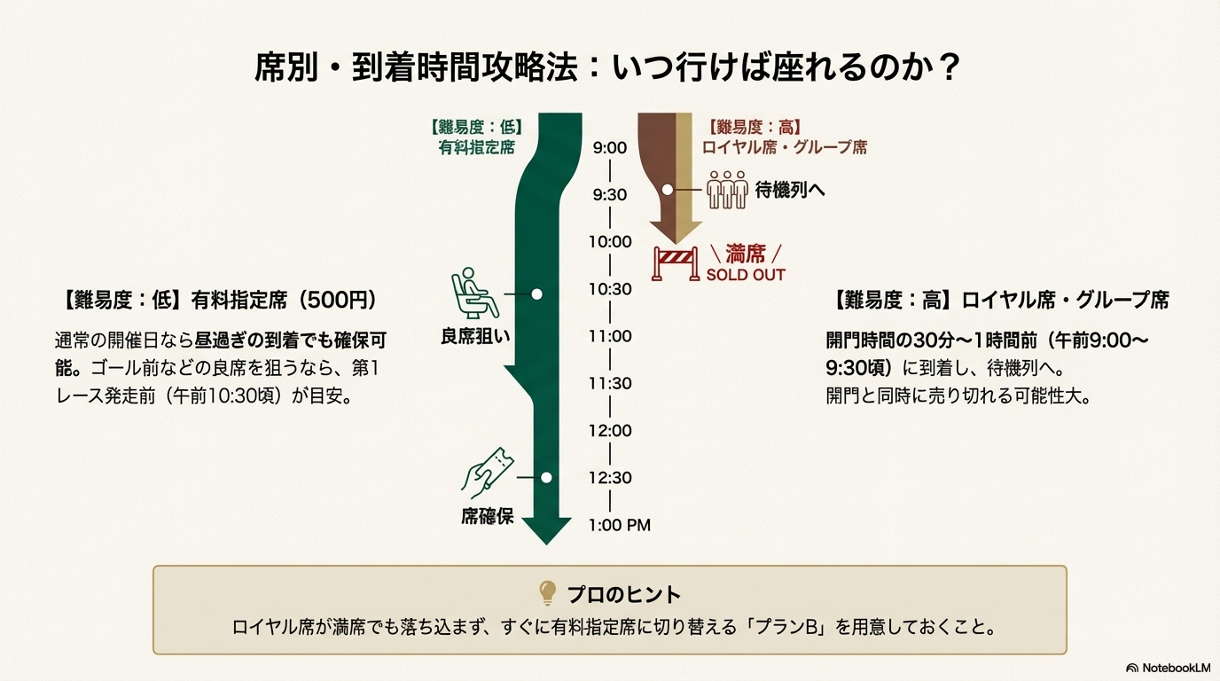 この32席は、ゴール板を真正面に望む、場内で最も見晴らしの良い「一等地」に配置されています。そのため、重賞レース開催日やJRAのG1レース発売日(有馬記念や日本ダービーなど)には、このプラチナチケットを求めて開門前から行列ができることも珍しくありません。かつては整理券が配布されていたほどの人気エリアであり、「絶対にロイヤル席で観たい」という場合は、開門時間の30分〜1時間前には到着しておくくらいの気合と戦略が必要です。
