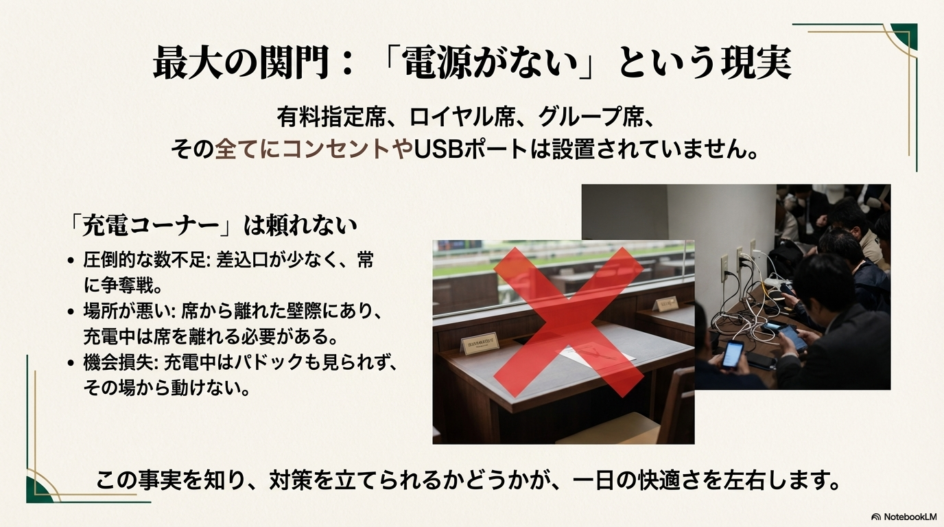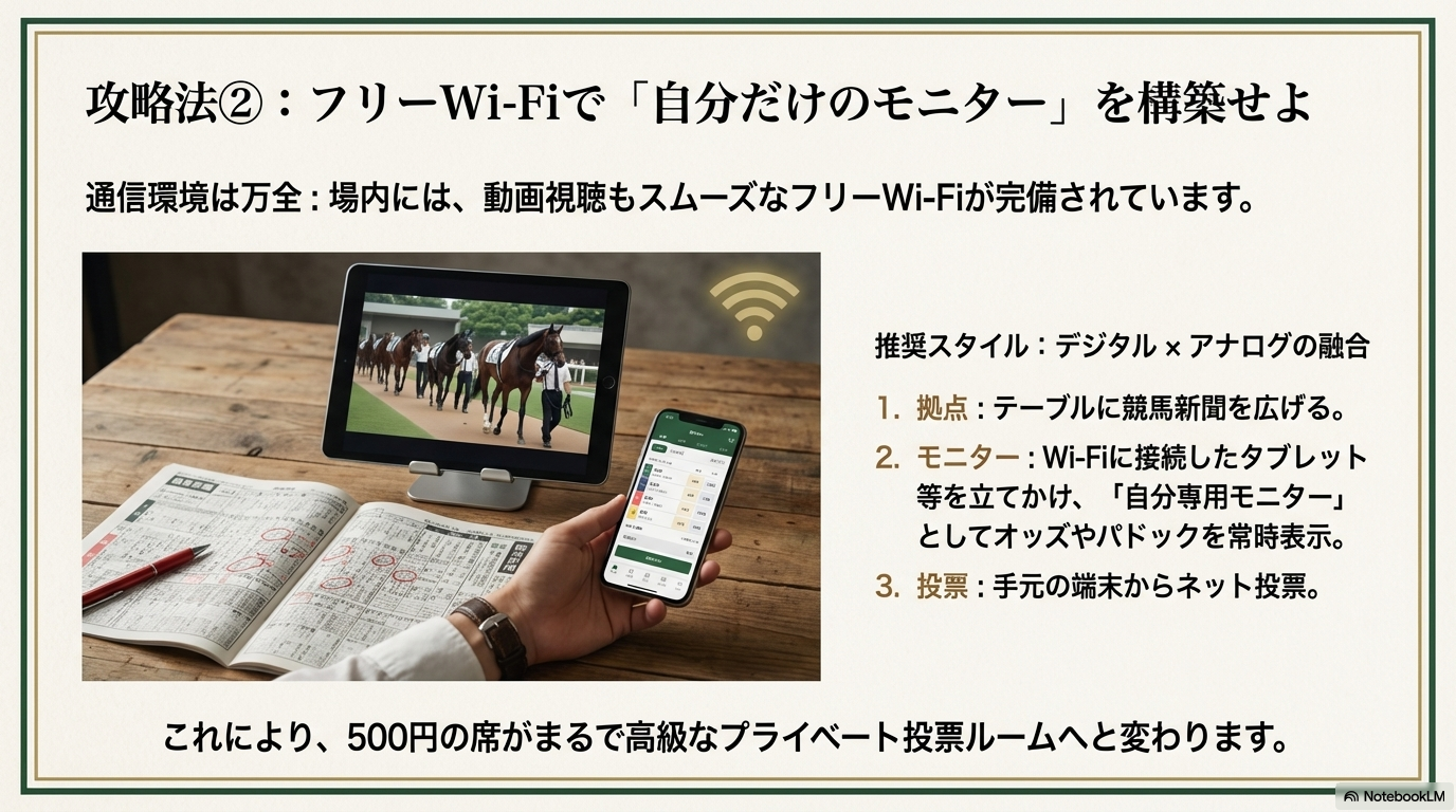 現在は場内のフリーWi-Fi環境が整っています。そのため、席では広々と新聞を広げつつ、手元のスマートフォンやタブレットで楽天競馬や地方競馬ライブの映像を流して「自分専用モニター」代わりにするスタイルが主流です。電源がない点だけ注意が必要ですが、このハイブリッドスタイルなら500円席のデメリットを完全にカバーできます。