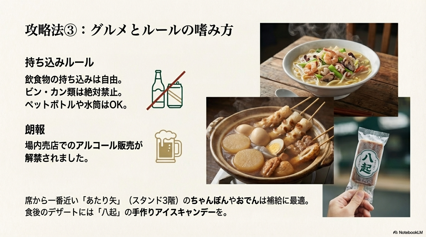 特に注目してほしいのが、スタンド3階にある「あたり矢」です。1階や2階の売店まで降りるのが面倒な時でも、指定席エリアのすぐ近くにあるこのお店なら、レースの合間にサッと温かいちゃんぽんやおでんを調達できます。「指定席ユーザーの補給基地」として活用しましょう。