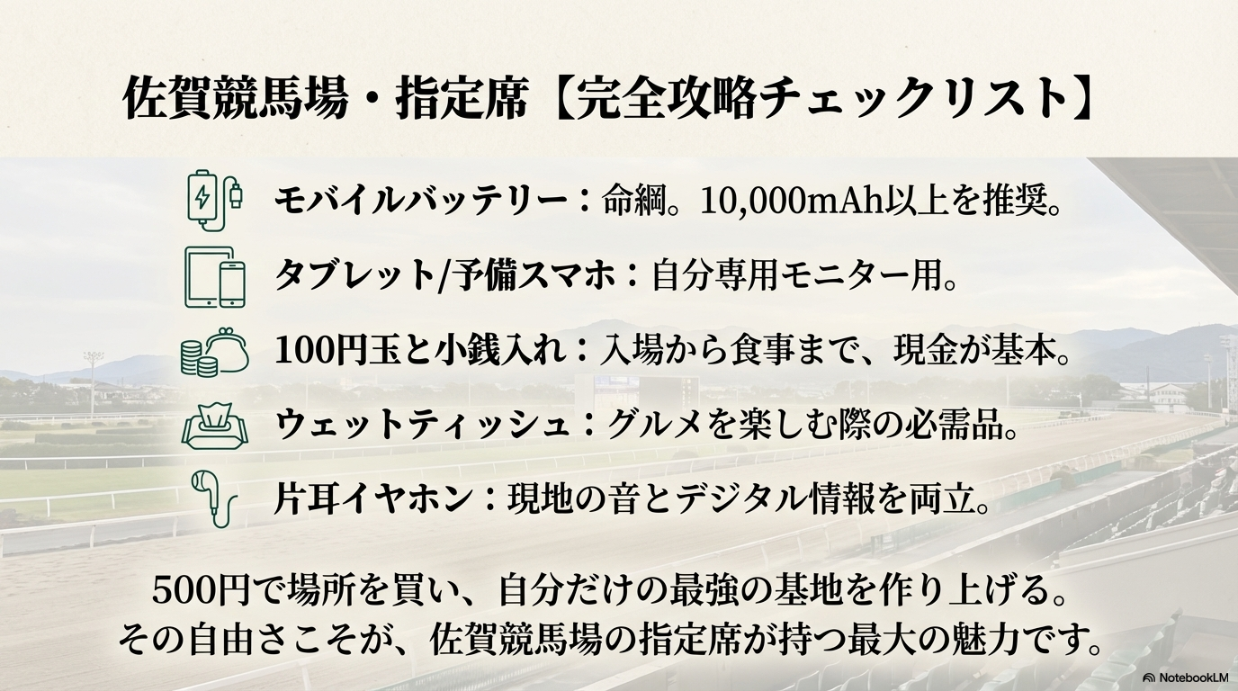 最後に、私が長年の遠征経験から導き出した、佐賀競馬場の指定席を「極上の快適空間」へと変えるための【完全攻略・持ち物チェックリスト】を伝授します。これさえあれば、不便さを感じるどころか、むしろそのアナログ感を愛おしく感じるはずです。