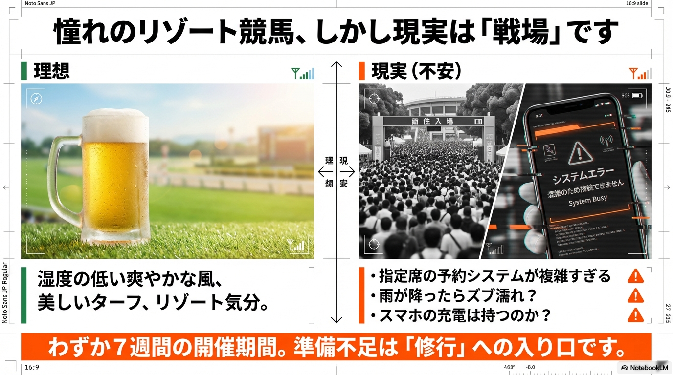 確かに、人気日の予約は激戦ですし、設備の古さや雨のリスクなど、現地に行ってみないと分からない落とし穴もたくさんあります。何も知らずに行くと、「雨でずぶ濡れになった」「スマホの充電が切れた」「席がなくて一日中立ちっぱなしだった」という苦い思い出になってしまうかもしれません。