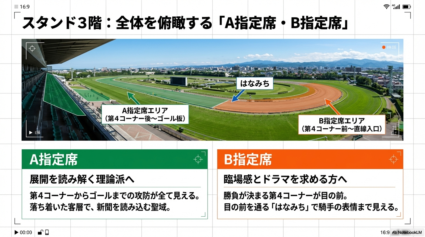「馬券の収支にこだわりたい」「レースの全体像を把握したい」という理論派の方には、間違いなくスタンド3階のA指定席が最適解です。