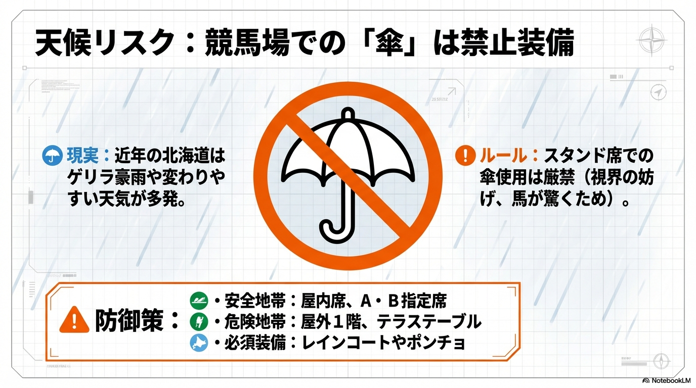 - 屋根の恩恵:前のセクションでも触れましたが、札幌競馬場の屋外2階席後方は、大きな屋根の下に入るため、多少の雨なら凌げます。
