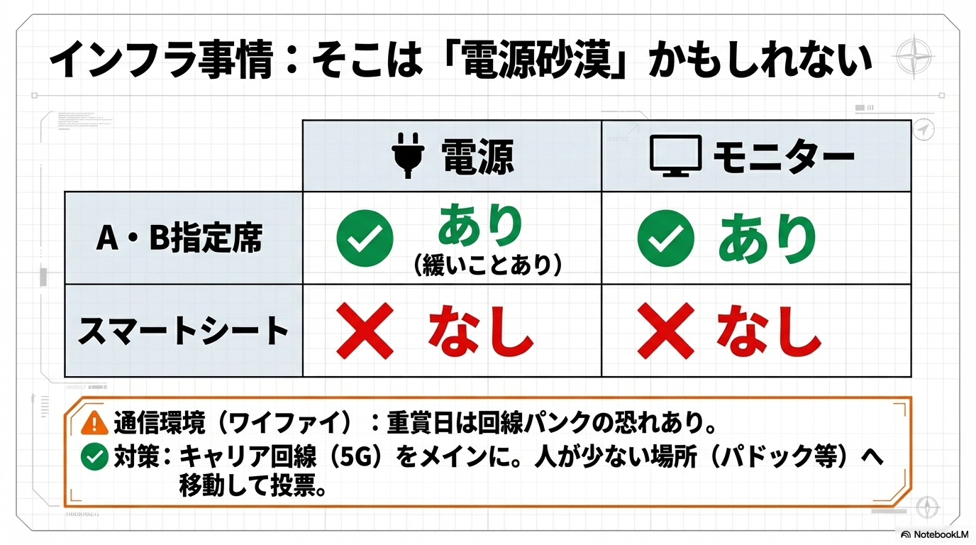 そう思い込んで現地に行き、昼過ぎにはスマホが文鎮化して絶望する…。そんな悲劇を避けるために、札幌競馬場の設備事情を包み隠さずお伝えします。結論から言うと、「席のグレードによって天と地ほどの差がある」のが現実です。