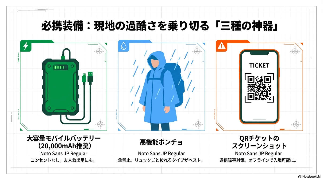現地は想像以上に過酷です。直射日光、急な雨、硬い椅子、そして電波混雑。これらに立ち向かうために、私がいつも装備している「三種の神器」+αの必須アイテムをご紹介します。これさえあれば、当日のストレス値が劇的に下がりますよ。