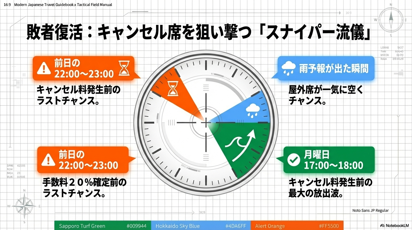 JRAの予約システムには、キャンセルされた席が大量に在庫に戻ってくる「特定のタイミング」が存在します。これは、キャンセル料の発生ルールや、人間の心理(予定の確定や天候への懸念)と密接に連動しています。この法則を知っているだけで、満席表示(×)だったプラチナチケットが、突然空席(△)に変わる瞬間を狙い撃つ「スナイパー」になれるのです。