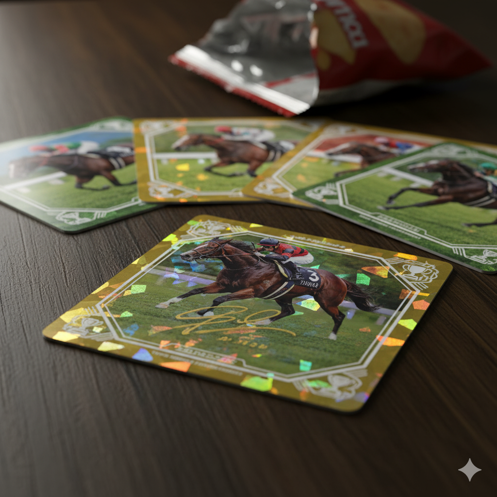 まず第一に、その豪華な仕様です。カードは全種類が光り輝くホログラム仕様となっており、光の角度によってキラキラと表情を変え、非常に高級感があります。さらに、一部のカードには、その馬に騎乗したトップジョッキーのサインが金色で美しく箔押し(はくおし)されたレアカードも存在します。このサインカードは、通常カードと同じ絵柄ながらも、金色の輝きが加わることで格別の所有満足感を与えてくれ、多くのコレクターの収集目標となっています。